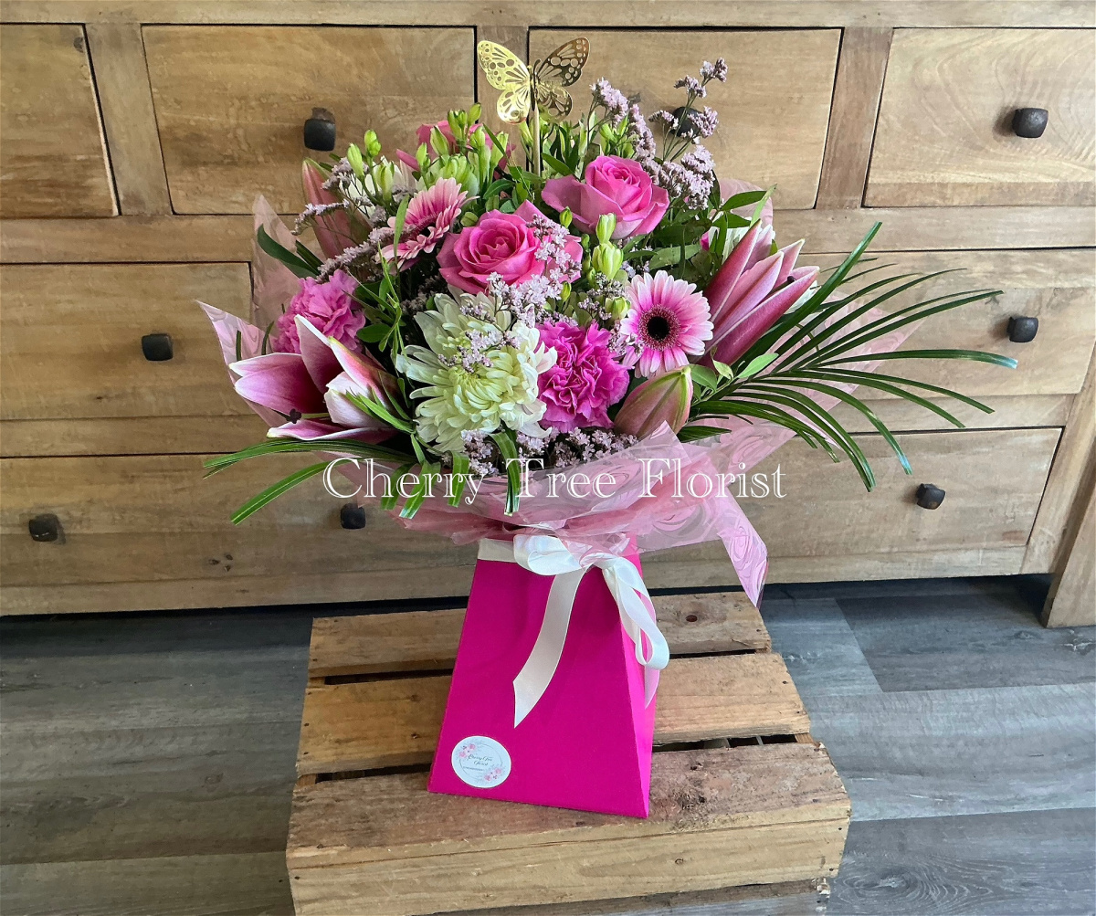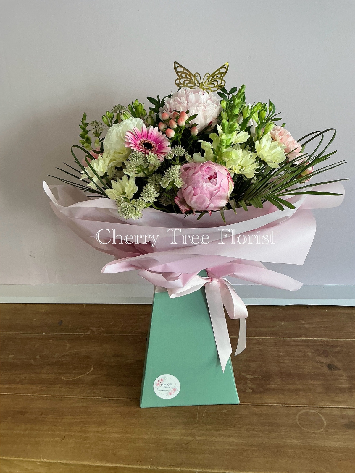 The Florist Choice Bouquet is a beautiful hand-tied bouquet. All flowers and foliages used are of the best quality. This bouquet will consist of a variety of florist choice flowers such as roses, Carnations, Alstromeria, Chrysanthemums, Gerberas, etc.