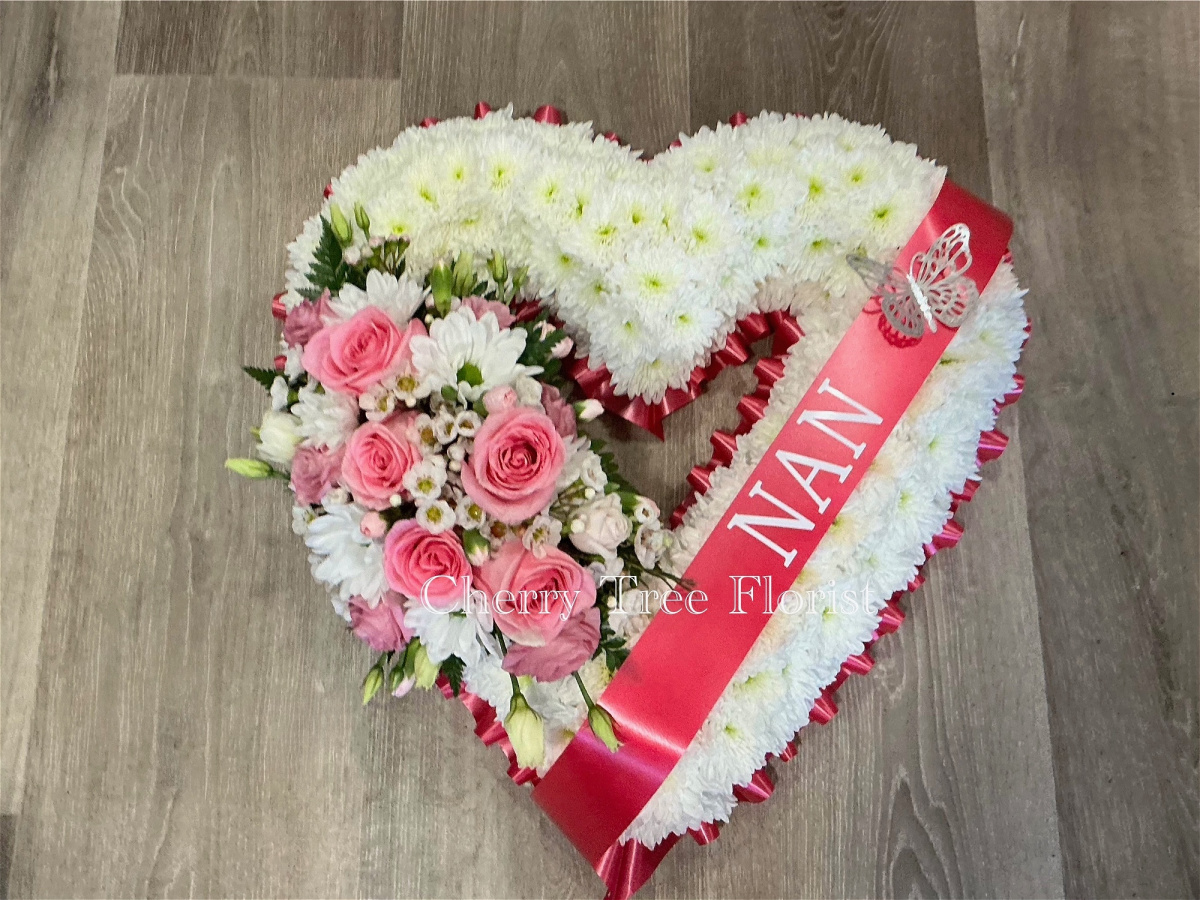 This beautiful heart is based with chrysanthemums. It is edged with a pretty ribbon. The colour of the ribbon is then complimented with a pretty spray of flowers.