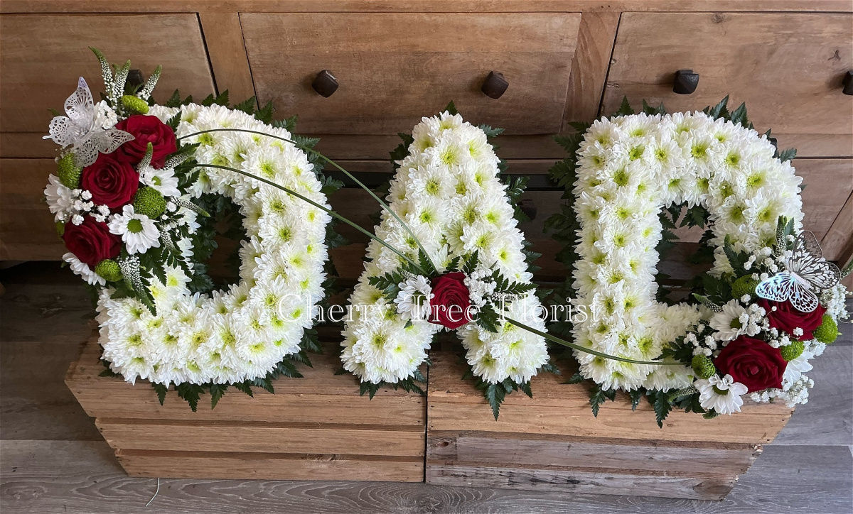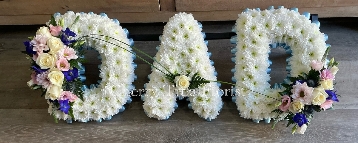 These beautiful Letters are normally based with white chrysanthemums. The letters are edged with ribbon. The colour of the ribbon is then complimented with a spray of flowers on some of the letters.