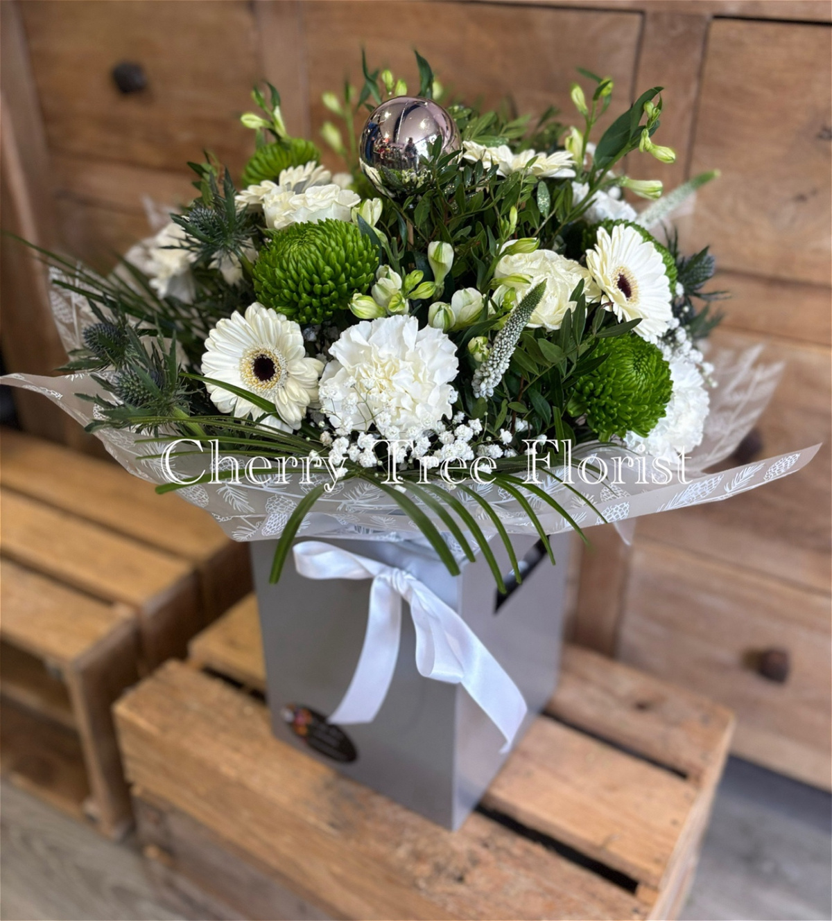 This gorgeous “Touch of Frost” hand tied bouquet is the perfect gift for anyone this Christmas.