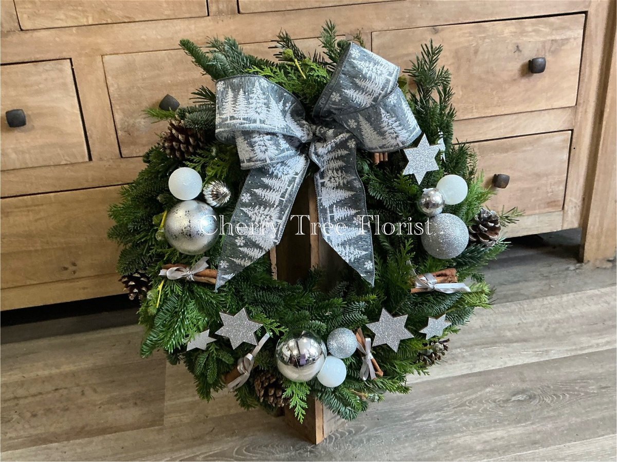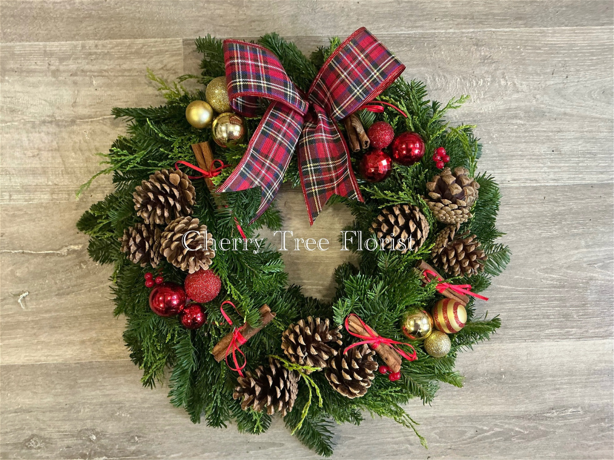 Decorated similar to pictures which may include cinnamon sticks, dried orange slices, oranges and limes. Pine cones, lotus heads and a pretty bow. The colours of the bows will depend on availability.