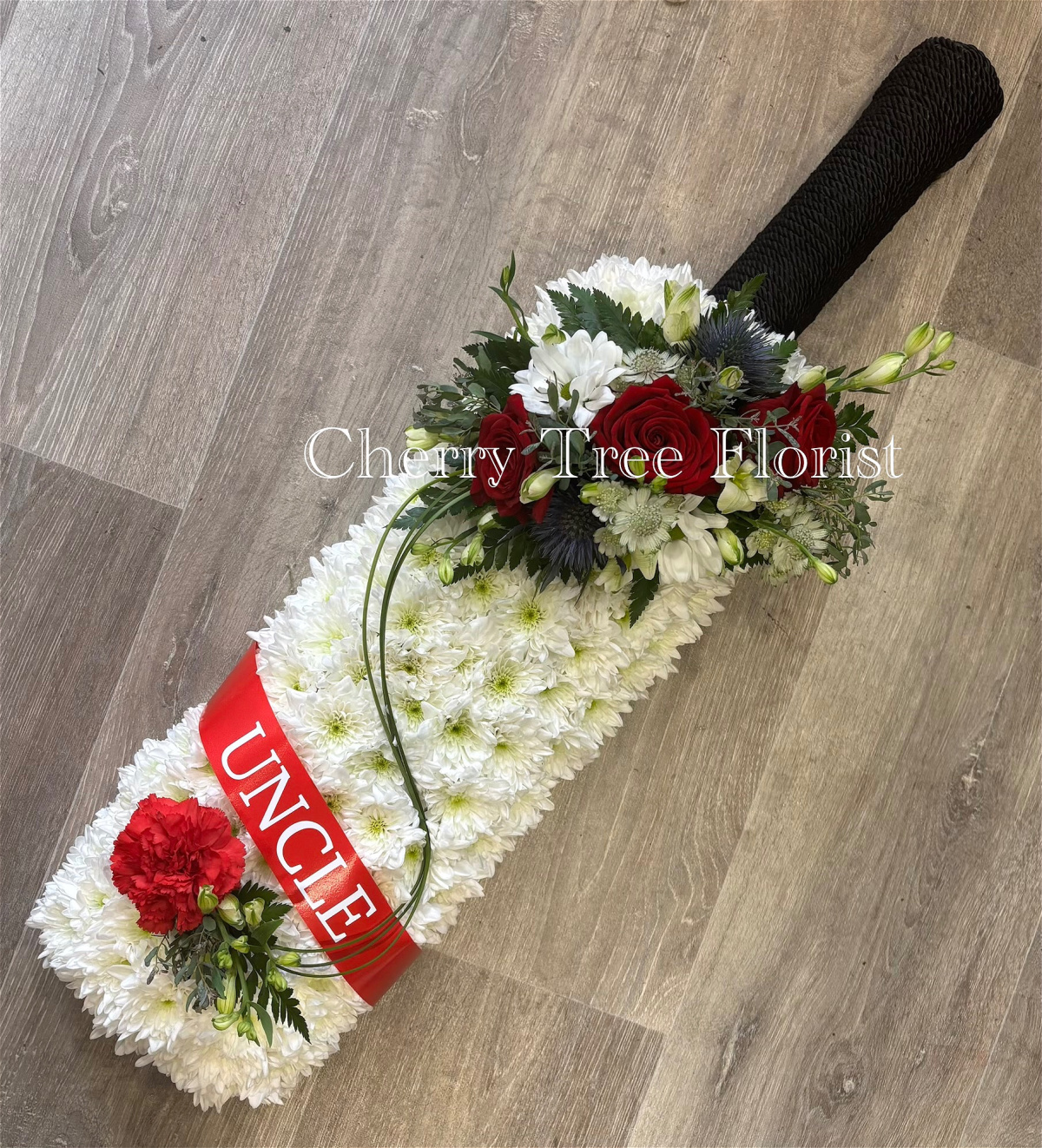 This bespoke cricket bat funeral tribute has been thoughtfully designed to honour a much-loved Uncle. Featuring a striking red, white, and green colour palette, it includes elegant roses, chrysanthemums, and seasonal blooms, finished with a personalised ribbon reading “Uncle”. The cricket bat design makes it a perfect tribute for someone who had a love for the game.